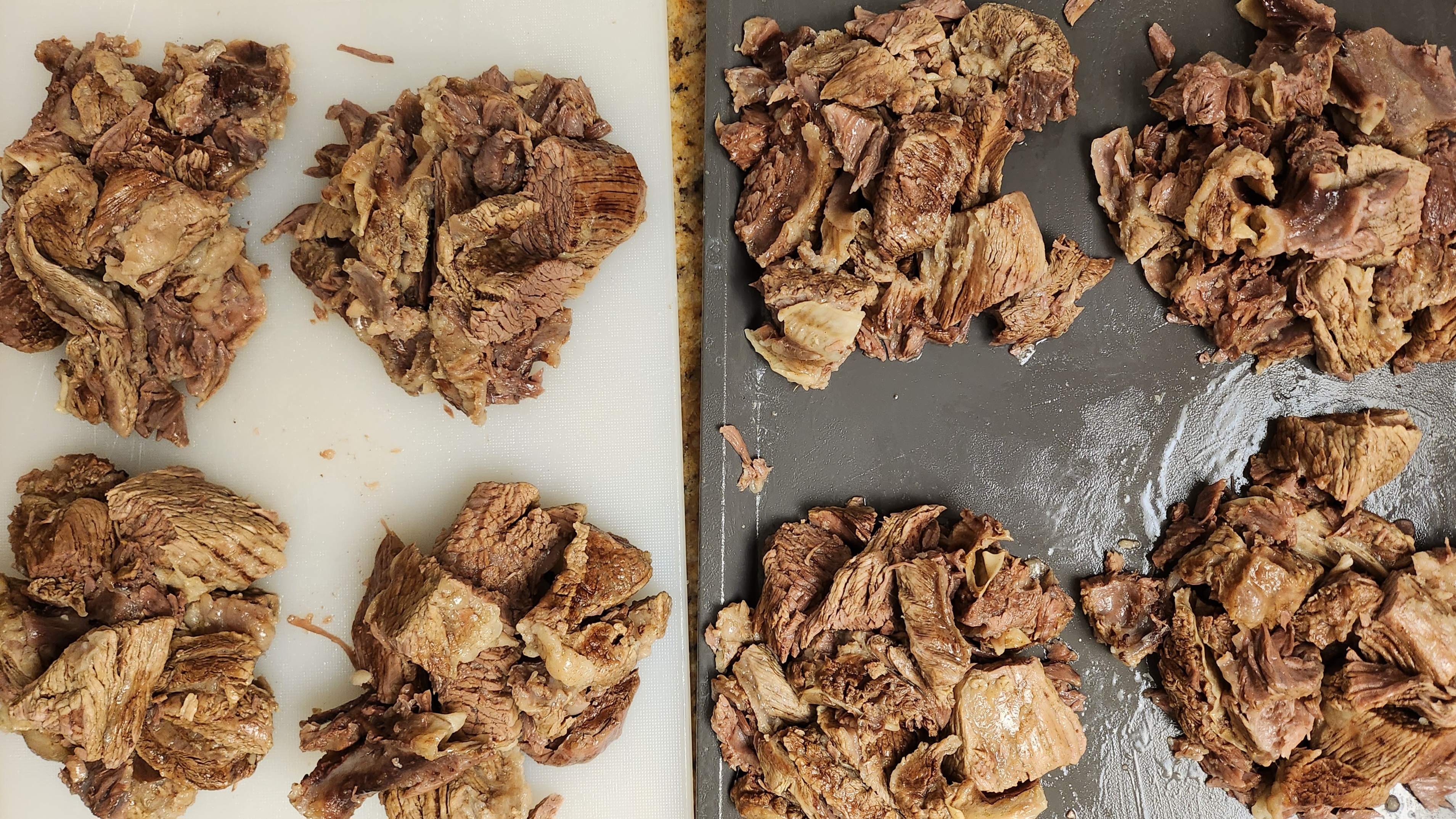 뼈와 살을 분리한 후 1인분 씩 소분해 주었다. 매우 뜨겁지만 목장갑+위생장갑을 사용하면 잘 분리해 낼 수 있다. 백립 6.17lb(2.8kg)+트라이팁 약 2.7lb(1.2kg)로 8인분의 갈비탕이 나왔다. 무도 고기에 맞춰서 8등분 해주었다.