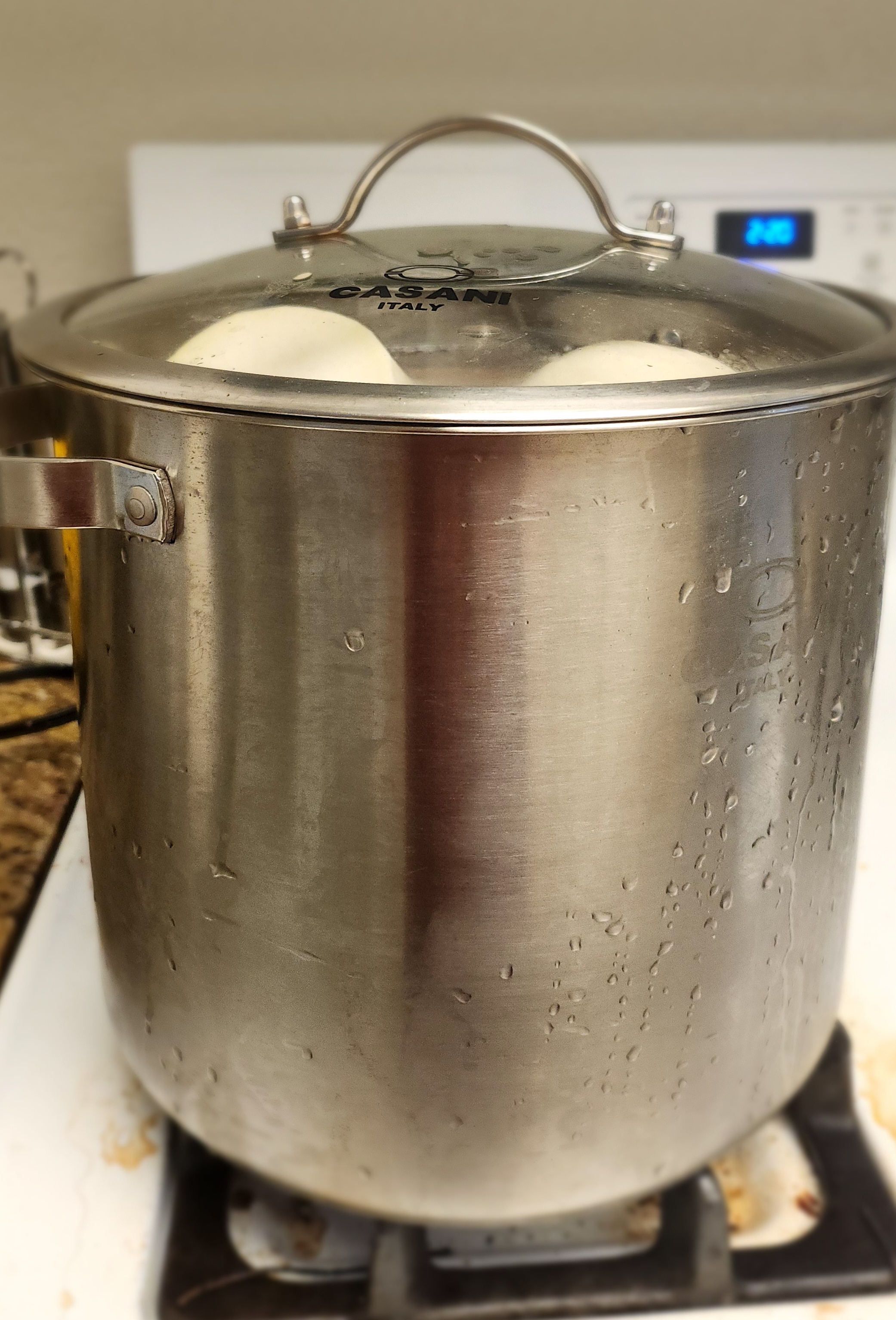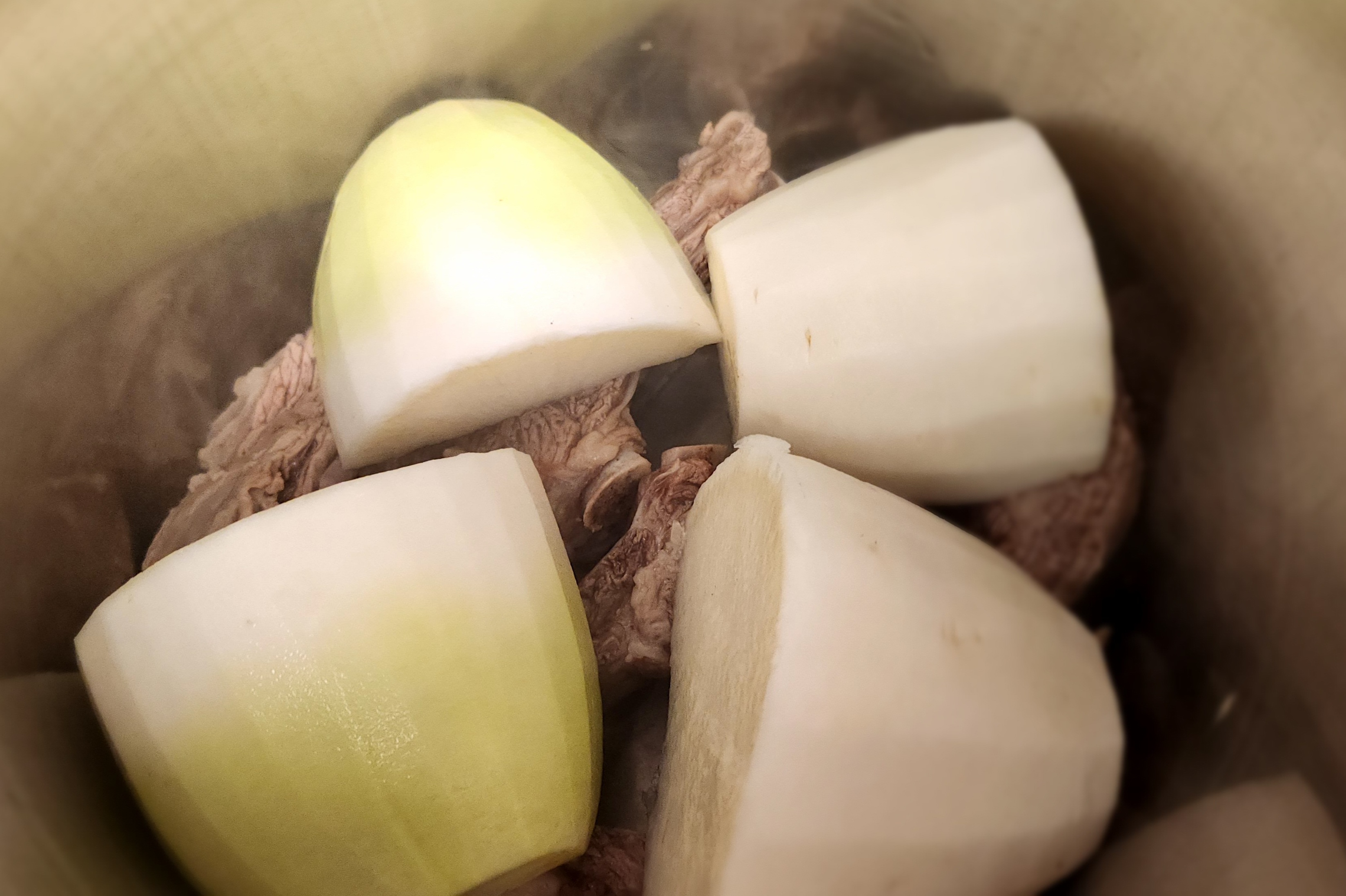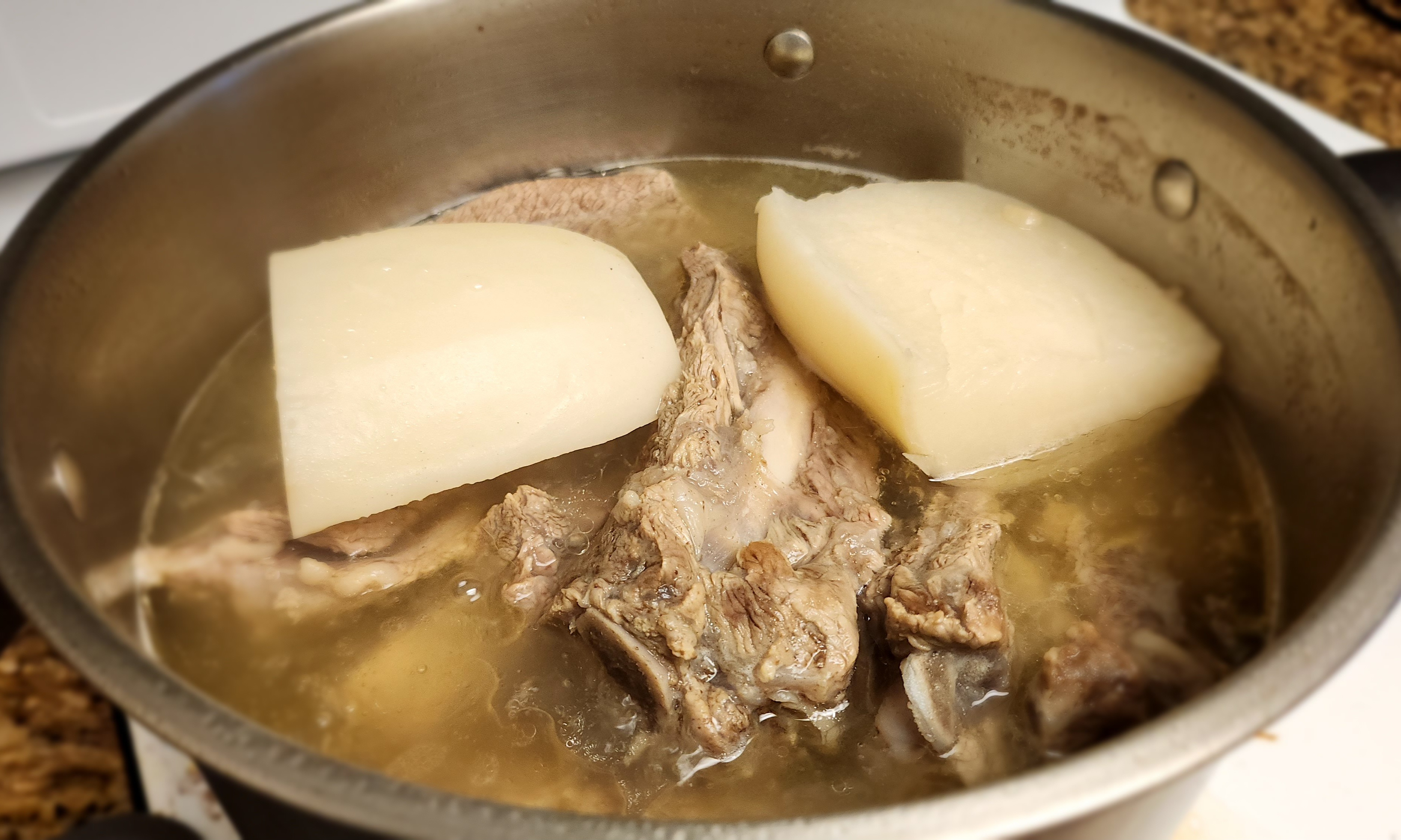 무를 크게 썰어서 같이 넣어준다. 고기-무-고기-무 순으로 잘 쌓아주었다. 물을 가득 넣고 끓이기 시작한다. 처음에는 뚜껑을 덮고 강불로 끓이다가 물이 끓으면 뚜껑을 열고 중불로 바꿔주었다. 물을 끓은 후 중불로 1시간 30분 삶아준다.